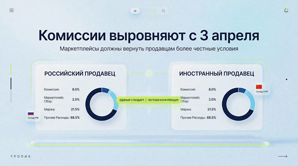 На маркетплейсах назрел важный для продавцов сдвиг. С 3 апреля Ozon и Wildberries должны выровнять комиссии для российских и иностранных продавцов. Если объяснить совсем просто, смысл новости такой: площадки больше не смогут держать ситуацию, в которой один продавец работает по одной экономике, а другой, с похожим товаром, по более мягкой. Для российского селлера это не абстрактная история про регулирование, а вполне практичный вопрос маржи, цены и конкуренции.
