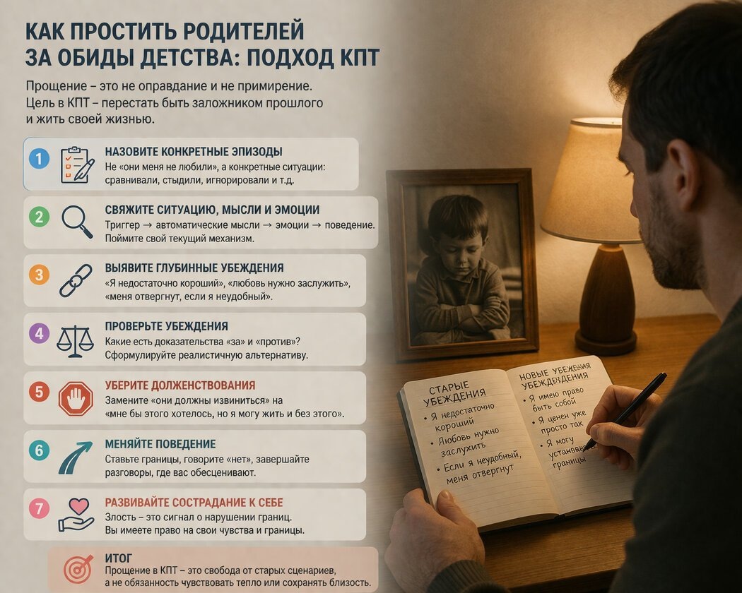 Когда мы говорим про “простить родителей” с позиции КПТ, то смотрим вглубь, а именно пытаемся понять какие убеждения сформировали эту обиду и как она влияет на жизнь человека сейчас. Потому что если вы пытаетесь и говорите что хочу простить, но внутри по прежнему сохраняются эти убеждения что “со мной что то не так” или “я должен быть удобным”, это не сработает. Вы просто добавите ещё и вину за то, что “не получается простить”. 1) Развести понятия, "я должен простить", "оправдать", "примириться".