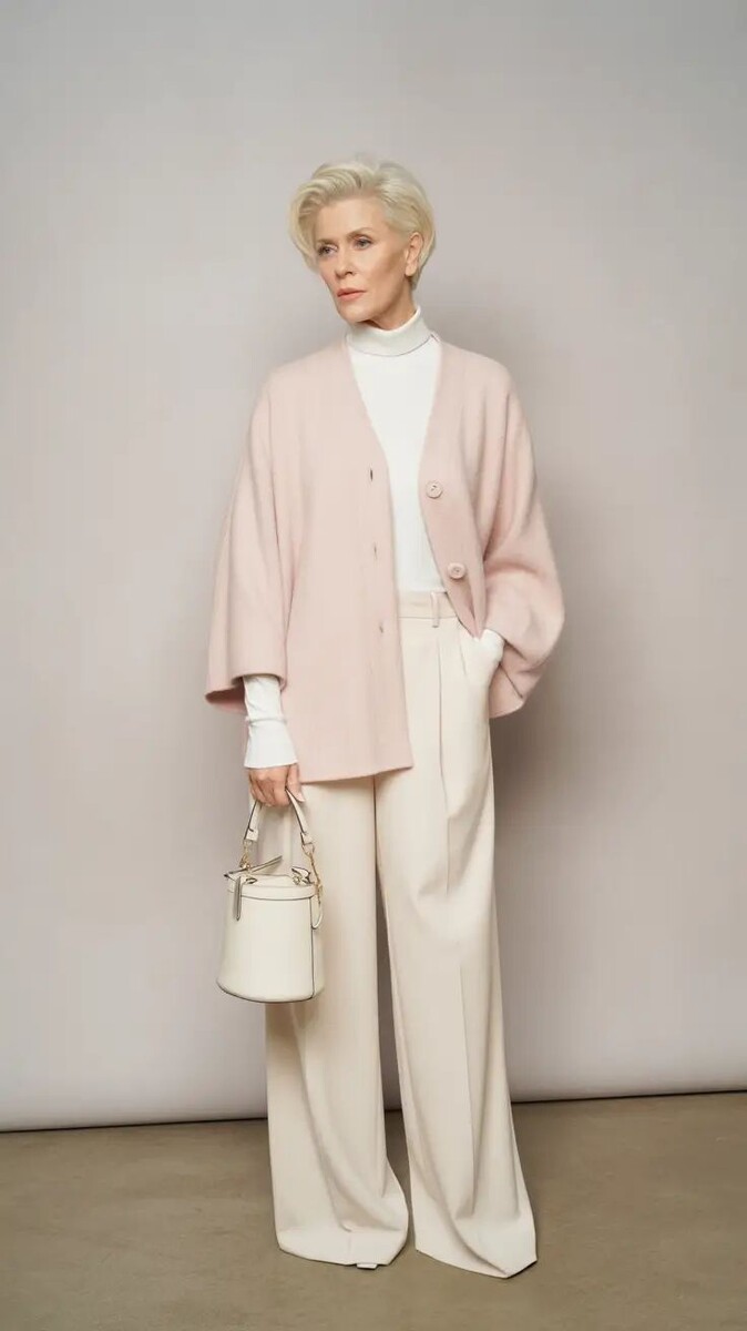 Весной каждой женщине вне зависимости от возраста хочется выглядеть свежо, нежно, притягательно и неповторимо. Сбросив, наконец, груз практичной теплой одежды, стильные дамы за 60 примеряют новые легкие и привлекательные образы, в которых им не будет равных. 1. Прямые кремово-белые классические брюки со стрелками, лаконичная белая водолазка, аккуратно заправленная за пояс, и бежевый с розовым подтоном кардиган с оригинальными широкими рукавами длиной ¾ – спокойное, минималистичное и при этом очень нежное сочетание. Все вещи в ансамбле дополняют и подчеркивают друг друга, объединяясь в стильный весенний образ, в котором дама 60+ будет выглядеть притягательно и пленительно-женственно. 2. Лаконичные бежевые брюки классического кроя со стрелками, гармонично дополненные светлым джемпером фактурной вязки с высоким горлом, формируют элегантный и сдержанный городской «лук». Для яркой цветущей весны этот ансамбль стоит дополнить пальто строгого кроя и нежного приглушенно-розового цвета, который