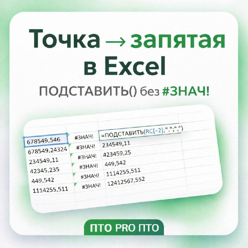 ? 😭Знакома ситуация когда скопировал данные к себе в таблицу, а они не читаются? Или из-за точки не пригодны к вычислению в формуле? Когда приходится каждую ячейку открывать и удалять символ? 📝Дано: ПОДСТАВИТЬ, да нет, не коллегу с этой задачей, а функцию. Функция ПОДСТАВИТЬ в Excel - это как «найти и заменить», только прямо в формуле. Она берёт текст, находит в нём кусочек и заменяет на другой. 📝Решение: 🟢Пиши в ячейке =ПОДСТАВИТЬ(A2;".";",") где: А2 — отсылка на ячейку с исходными данными "." — точка которую нужно заменить "," — на что хотим заменить Например: 1⃣Заменить все пробелы на подчёркивания (для файлов/реестров) Если в A2: Акт КС-2 12 01 2026 Формула =ПОДСТАВИТЬ(A2;” “;”_”) Получим: Акт_КС-2_12_01_2026 2⃣Убрать лишние слова/приставки Если в A2: Договор № 15/ПТО =ПОДСТАВИТЬ(A2;“Договор № “;””) Получим: 15/ПТО (то есть заменили фразу на “ничего”) 3⃣Заменить только первое вхождение (важный момент!) Если в A2: Адрес, ул. Ленина, д. 10 Хотим заменить только первую запят