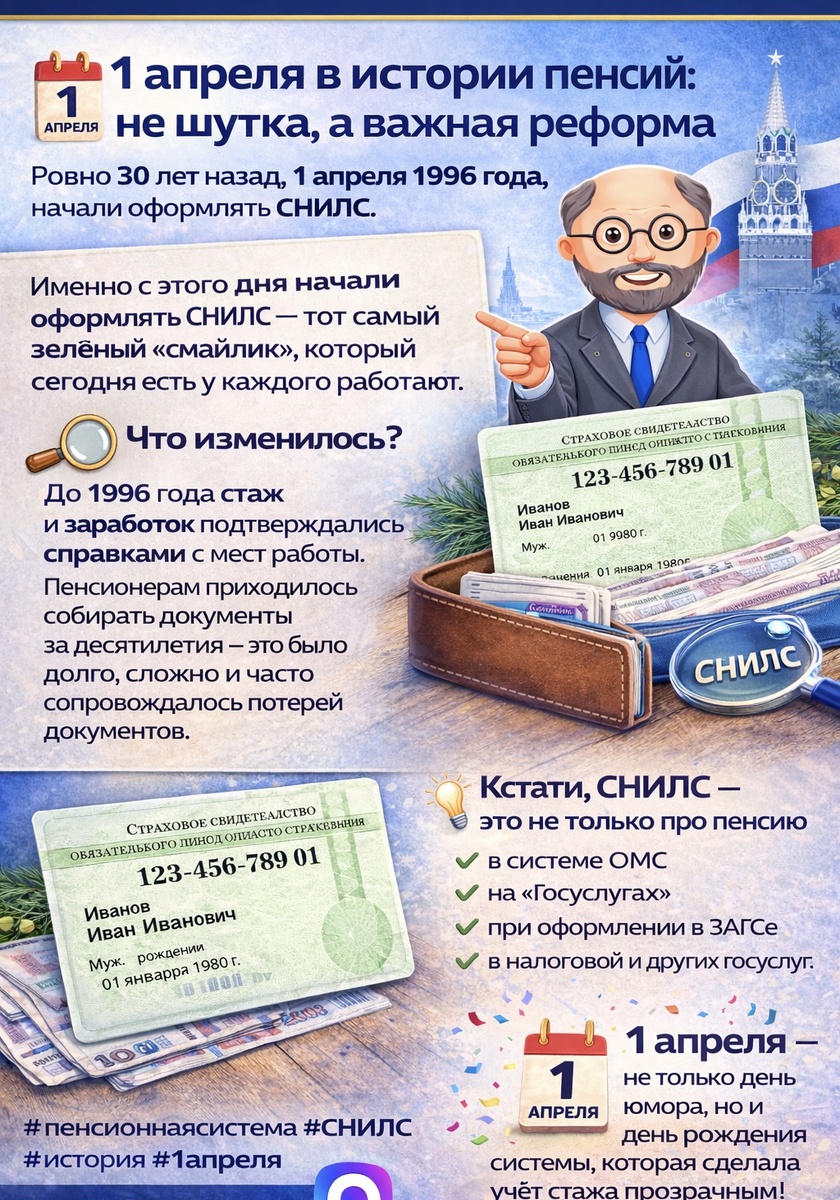 Ровно 30 лет назад, 1 апреля 1996 года, в России вступил в силу Федеральный закон об индивидуальном (персонифицированном) учёте.