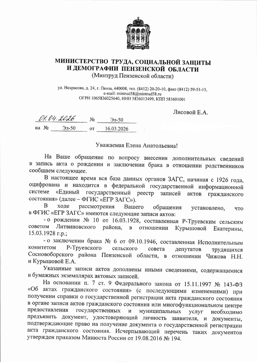 📩 Внесение иных сведений в ЕГР ЗАГС онлайн. Пензенская область ❤️"Белый список" регионов с возможностью внесения иных сведений в ЕГР ЗАГС онлайн без необоснованных бюрократических преград пополнило Управление ЗАГС Пензенской области! Алгоритм действий: 1️. Определяем регион совершения актовой записи и его дату. До 1926 г. - книги ЗАГС в рег. архивах, поэтому без доказывания родства можно получить доступ к книгам ЗАГС в архиве. После 1926 г. бумажные книги хранятся в архивах ЗАГС по месту совершения актовой записи. Мои актовые записи были совершены на территории Пензенской области. ❗️Для подачи обращения онлайн важно найти онлайн-приемную или иную форму для обращений граждан на официальном сайте регионального управления (комитета и т.п.) ЗАГС, или вышестоящего органа (министерства) как в данном примере. Обращения по электронной почте не принимаются. Напоминаю почему: С 30 марта 2025 года изменился порядок направления в госорганы обращений в форме электронных документов, исключено напра
