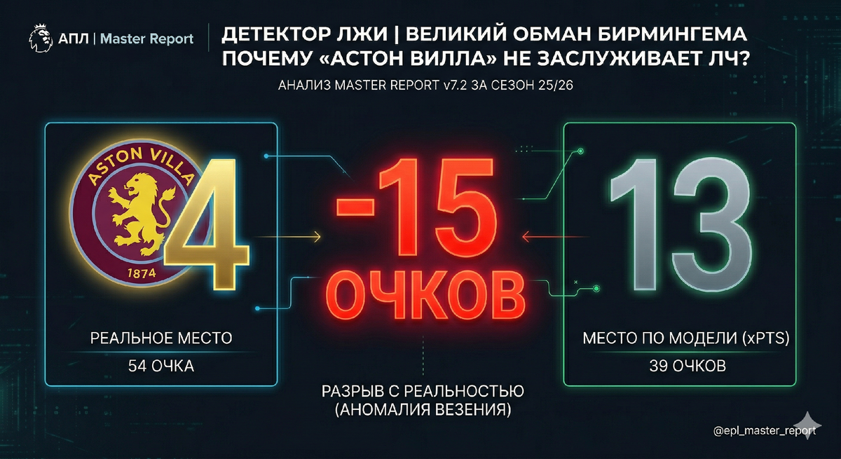 Пока фанаты на «Вилла Парк» празднуют потенциальное попадание в Лигу чемпионов и заказывают билеты на лучшие стадионы Европы, моя аналитическая модель Master Report v7.2 бьет в набат. Цифры кричат о том, что команда Унаи Эмери — самый «удачливый» коллектив текущего сезона 25/26. Если вы привыкли верить только таблице очков, приготовьтесь к неприятным открытиям. Разбираемся, почему текущий успех «Виллы» — это не торжество тактики, а грандиозная статистическая аномалия. Давайте взглянем на сухую статистику. Прямо сейчас «Вилла» идет на 4-м месте с 54 очками. Это реальность, которую мы видим в трансляциях. Но если мы обратимся к метрике ожидаемых очков (xPTS), которая оценивает качество игры, картина меняется драматически. Это самая большая аномалия в АПЛ прямо сейчас. Фактически, по качеству созданных и допущенных моментов «Вилла» должна находиться в нижней половине таблицы, рядом с «Борнмутом», а не сражаться с лидерами. Моя модель подсвечивает две фундаментальные проблемы, которые