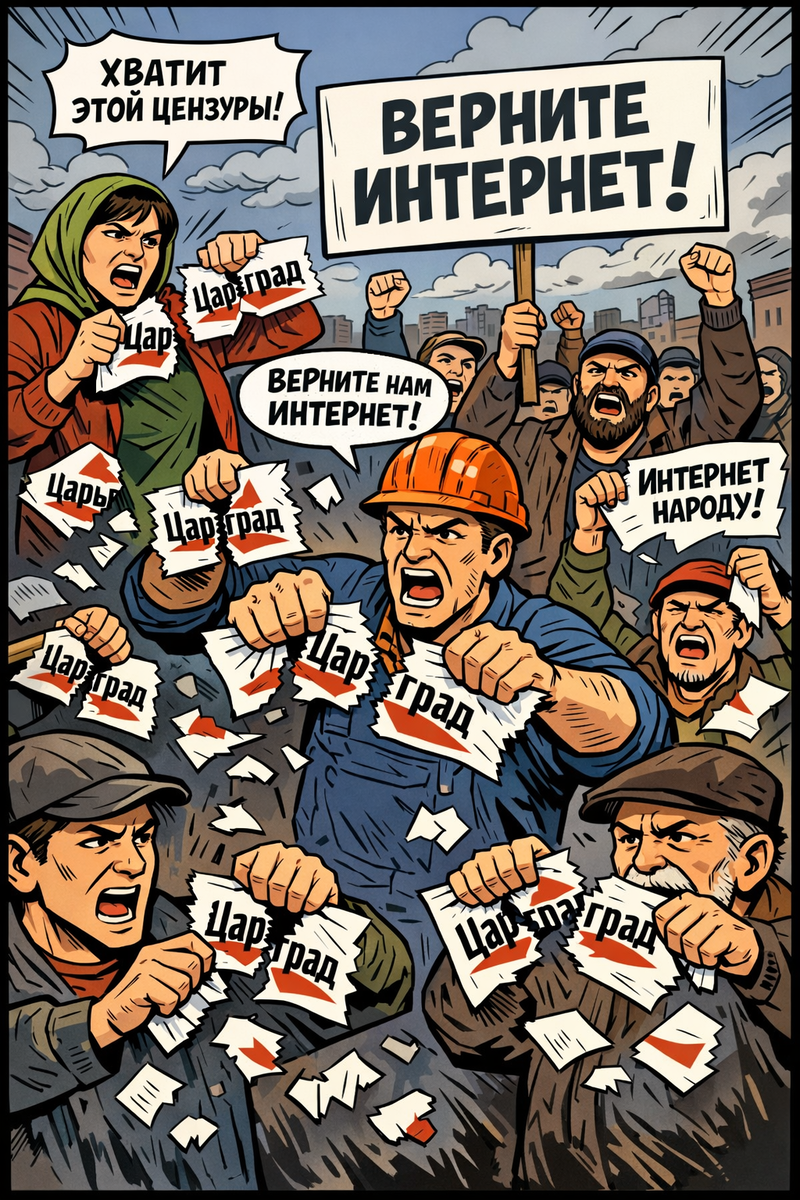 Представьте себе обычного человека, который вечером после работы открывает телефон, чтобы почитать новости. Он заходит в «Царьград» — канал, который позиционирует себя как «Первый русский», как голос настоящего патриотизма. И что он видит? Очередную статью, где любые попытки людей выразить недовольство ограничениями мобильного интернета и мессенджеров объявляются «происками Запада и пятой колонны».