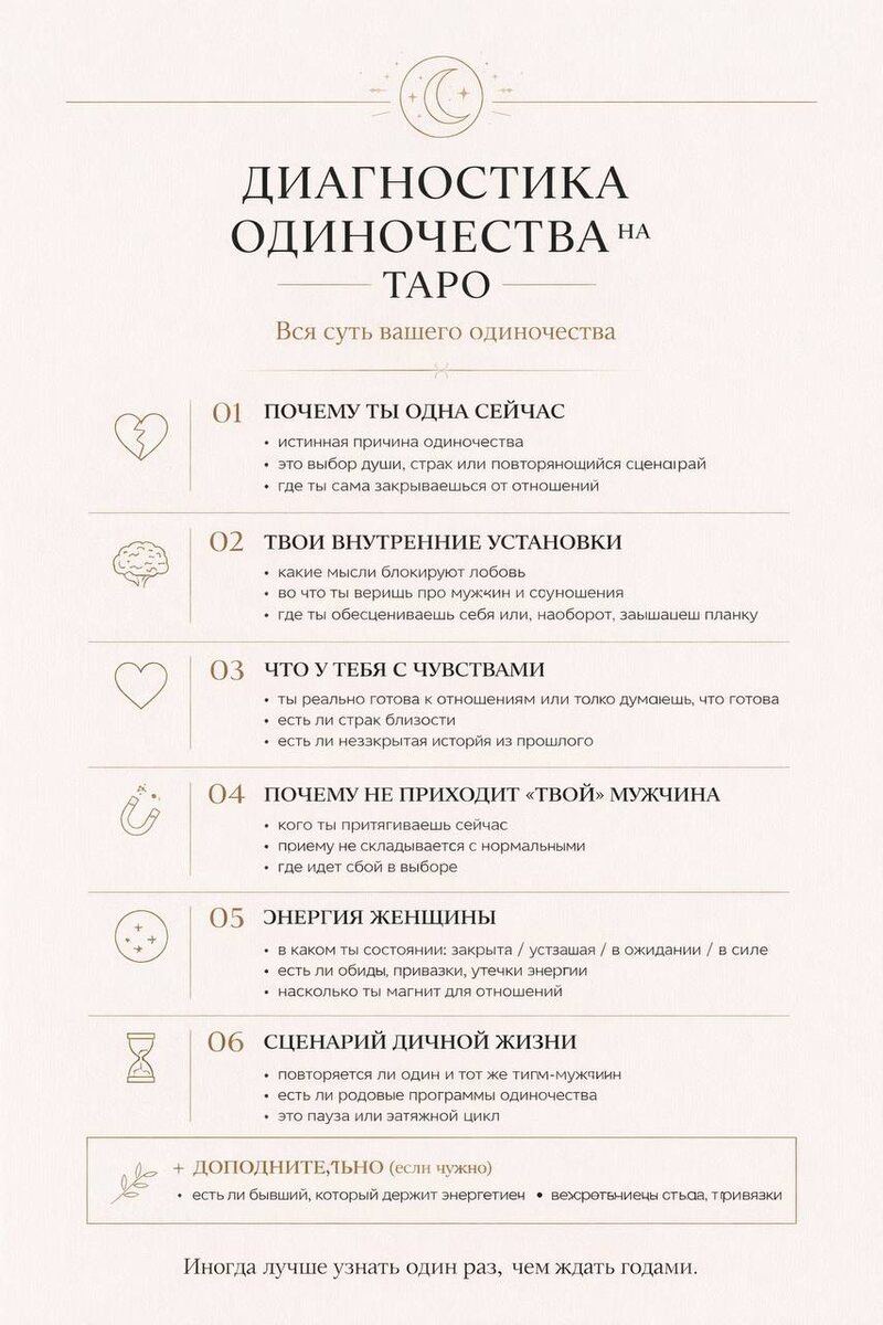 (не про «почему нет мужчины», а про то, ЧТО НА САМОМ ДЕЛЕ происходит в твоей жизни) Ты можешь думать: «просто не встретила своего» «ещё не время» «мне не везёт в любви» Но карты часто показывают совсем другое… Одиночество — это не случайность. Это либо программа, либо страх, либо сценарий, который ты даже не замечаешь. И вот тут начинается самое интересное 👇 💔 1. ПОЧЕМУ ТЫ ОДНА СЕЙЧАС — истинная причина одиночества — это выбор души, страх или повторяющийся сценарий — где ты сама закрываешься от отношений 🧠 2. ТВОИ ВНУТРЕННИЕ УСТАНОВКИ — какие мысли блокируют любовь — во что ты веришь про мужчин и отношения — где ты обесцениваешь себя или, наоборот, завышаешь планку ❤️ 3. ЧТО У ТЕБЯ С ЧУВСТВАМИ — ты реально готова к отношениям или только думаешь, что готова — есть ли страх близости — есть ли незакрытая история из прошлого 🔥 4. ПОЧЕМУ НЕ ПРИХОДИТ «ТВОЙ» МУЖЧИНА — кого ты притягиваешь сейчас — почему не складывается с нормальными — где идёт сбой в выборе 🧲 5. ЭНЕРГИЯ ЖЕН