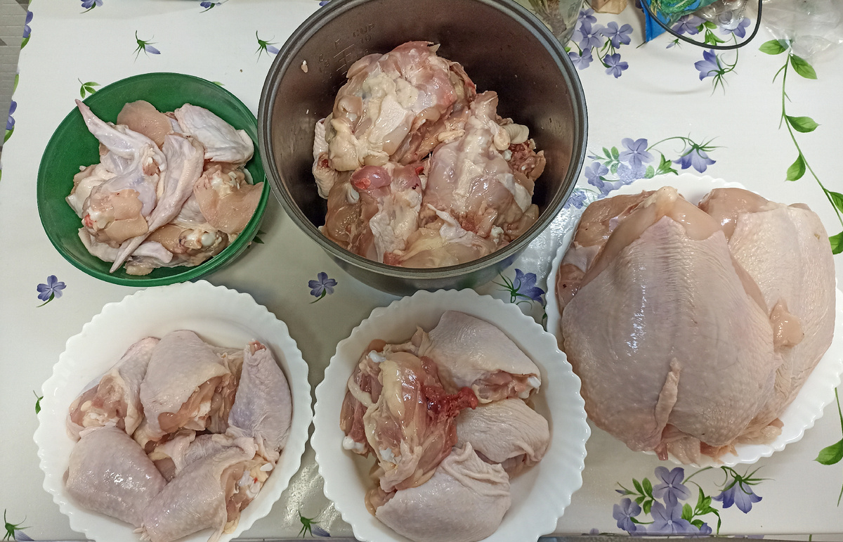 Первым делом разделала тушки на «рожки да ножки», то есть отделила бёдра, голени, крылья, аккуратно срезала грудку, а спинки и все косточки отправила в сторону для бульона.