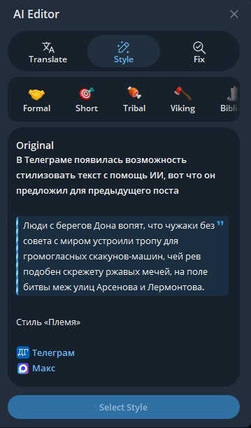 В Телеграме появилась возможность стилизовать текст с помощь ИИ, вот что он предложил для предыдущего поста
