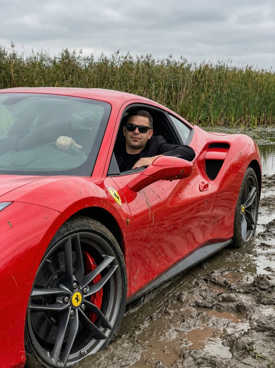 🤖Генерировать можно здесь: 👉БОТ ДЛЯ ГЕНЕРАЦИИ Режим Nano Banana 2/Pro ИНСТРУКЦИЯ Фотореалистичное изображение, снятое с низкого ракурса. В центре кадра — мужчина с загруженного фото черты лица пересены без изменений, в черных солнцезащитных очках и черном пиджаке, сидящий за рулем красного спортивного автомобиля Ferrari 488 GTB. Его лицо выражает спокойную уверенность и легкую ухмылку. Автомобиль покрыт брызгами грязи и стоит по колено в глубокой грязи на болотистой местности. На заднем плане видны высокие тростники и серое, пасмурное небо. Освещение мягкое, рассеянное, характерное для облачного дня. Глубина резкости средняя, фокус на лице мужчины и передней части автомобиля. Высокое качество изображения, детализация 8K, стиль рекламной фотографии с элементами экшн-съемки. Формат --ar 3:4. СГЕНЕРИРОВАТЬ 📸 СООБЩЕСТВО 📱