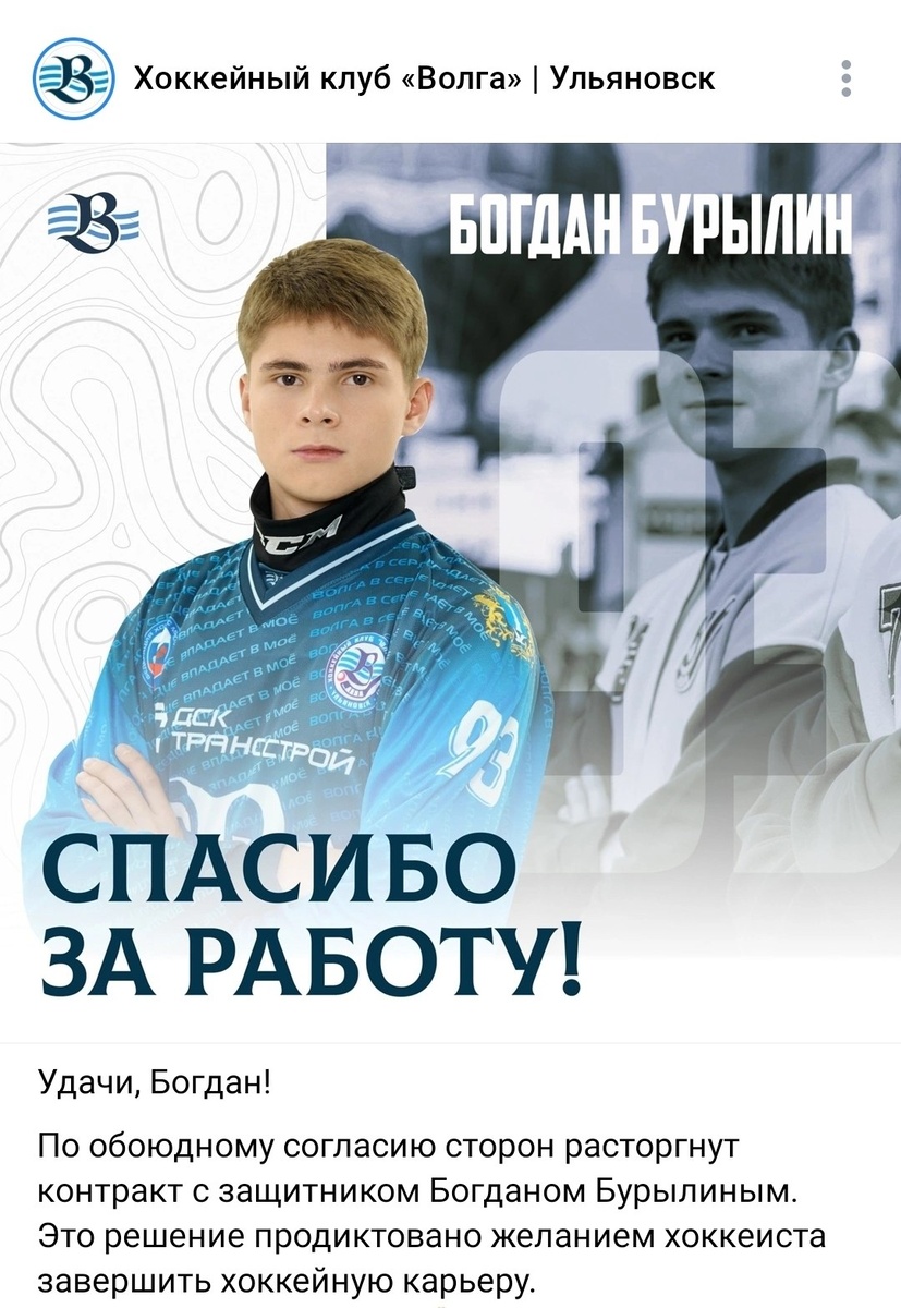 Защитник Волги Богдан Бурылин заканчивает с хоккеем