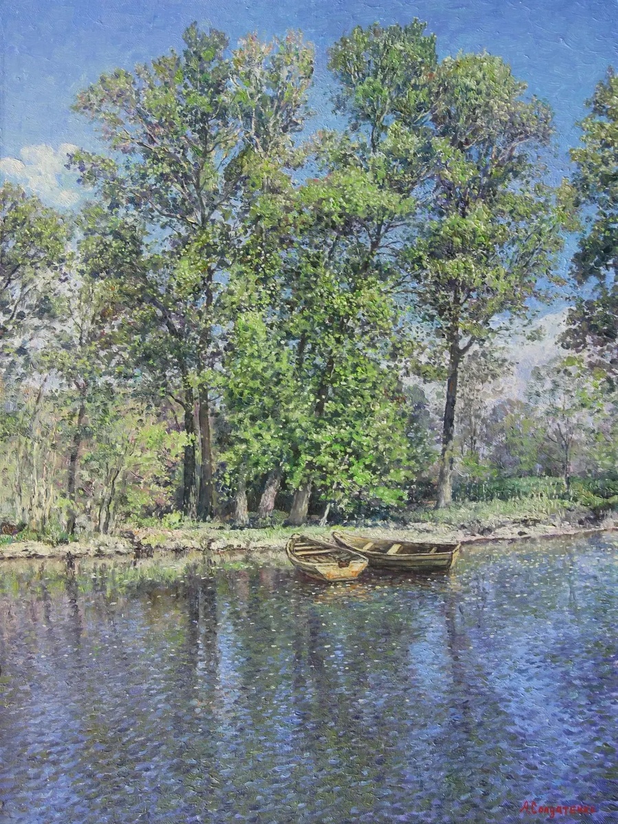 Деревья у воды и лодки (из серии "Волжские протоки") холст масло 60х45 2026 г Художник Андрей Солдатенко (СХР г.Саратов). Цена картины 18000 (без рамы). Можно оформить в раму по желанию покупателя. Скидки можно обсудить в ЛС. Доставка по России СДЭК (за счет покупателя)