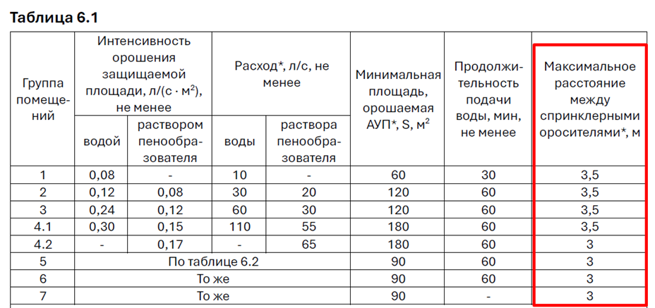 При наличии автоматического пожаротушения площадь горения пожарной нагрузки определяется шагом расстановки оросителей под покрытием помещения. Шаг расстановки оросителей принимается равным 3 или 3,5 метра в зависимости от группы помещений согласно таблице 6.1 СП 485.1311500.2020 (с Изм.1).