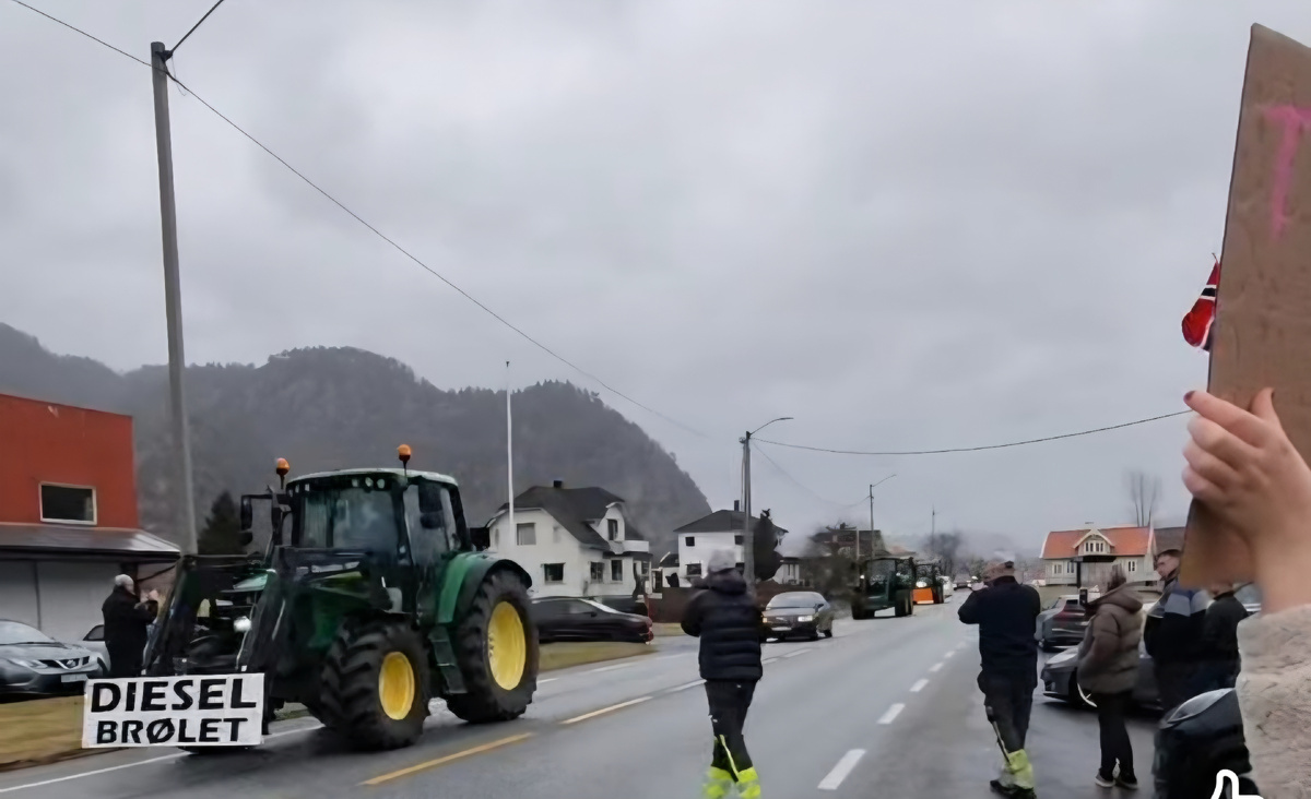 По причине понятных событий в Норвегии резко возрасли цены на бензин. На нашей заправке в марте цена достигала 25 крон и на бензин, и на дизель вместо докризисных значений в 19 крон . В северных районах цена доходила до 30 крон. И это при том, что Норвегия закупками нефти не занимается. Поэтому возмущенные граждане совместно с профсоюзами организовали акцию протеста по всей стране под лозунгом , который можно перевести как "Вопли дизеля." Целый день в пятницу по всей стране автомобили ездили со скоростью 40 км в час и демонстрировали соответствующие плакаты. Мы тоже проехались с Фредом в общей колонне, медленно передвигавшейся по центральной улице коммуны.