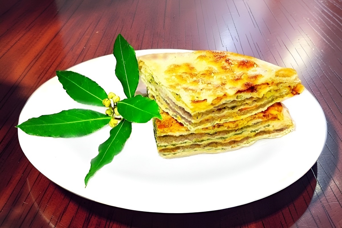 Затем раскатываем следующую лепёшку и укладываем её поперёк мясной основы, слегка увлажняем (можно просто мокрыми руками) и выкладываем слой зелени, немного прижимаем его: