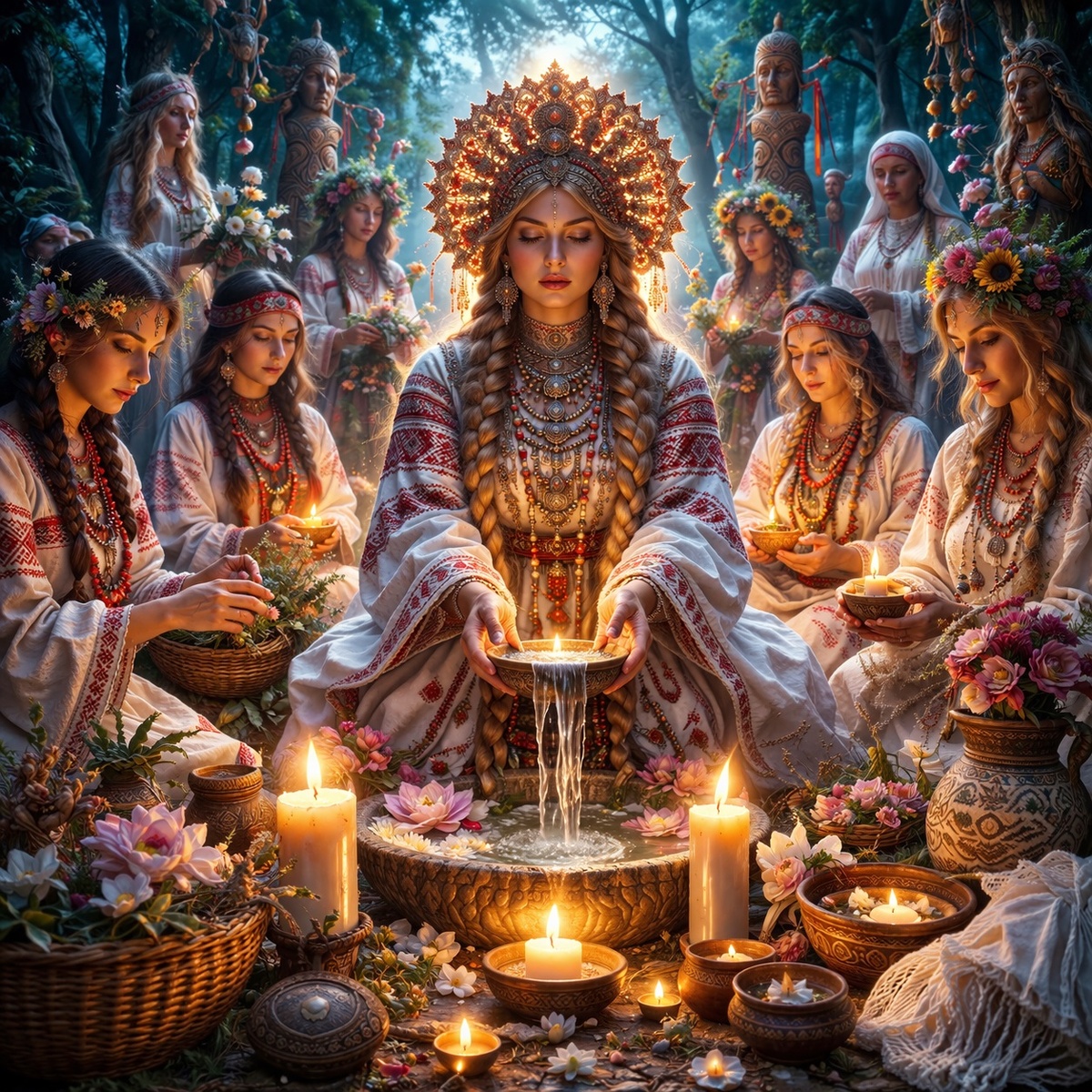 Сухой мир — мужской, воинский, прямой. Влажный мир — женский, глубокий, скрытый, но не менее страшный. И именно потому Мокошь кажется такой древней и мощной. Она ближе не к солнечному блистанию, а к подземной влаге дома, к колодцу, к сырой земле, к женскому телу и к тайне зарождения. Вот откуда берется ощущение, что ее обряды не должны были быть простыми. Они неизбежно касались воды — умывания, запрета на определенные работы, внимания к влажной стихии, к ткани жизни, которую нельзя пересушить и нельзя осквернить. Здесь я делаю осторожный вывод из атрибутов Мокоши, а не пересказываю прямой текст обряда.