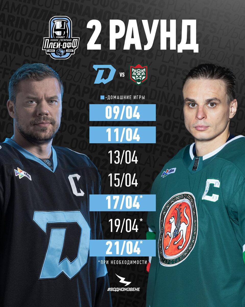 Первые матчи серии пройдут 9 и 11 апреля в Минске, 13 и 15 апреля серия переедет в Казань. 5-й и 7-й поединки серии "зубры" проведут на домашнем льду 17 и 21 апреля, если они понадобятся. Также, при необходимости, 6 матч пройдет в Казани. 🔴 Читайте Sputnik Беларусь в MAX