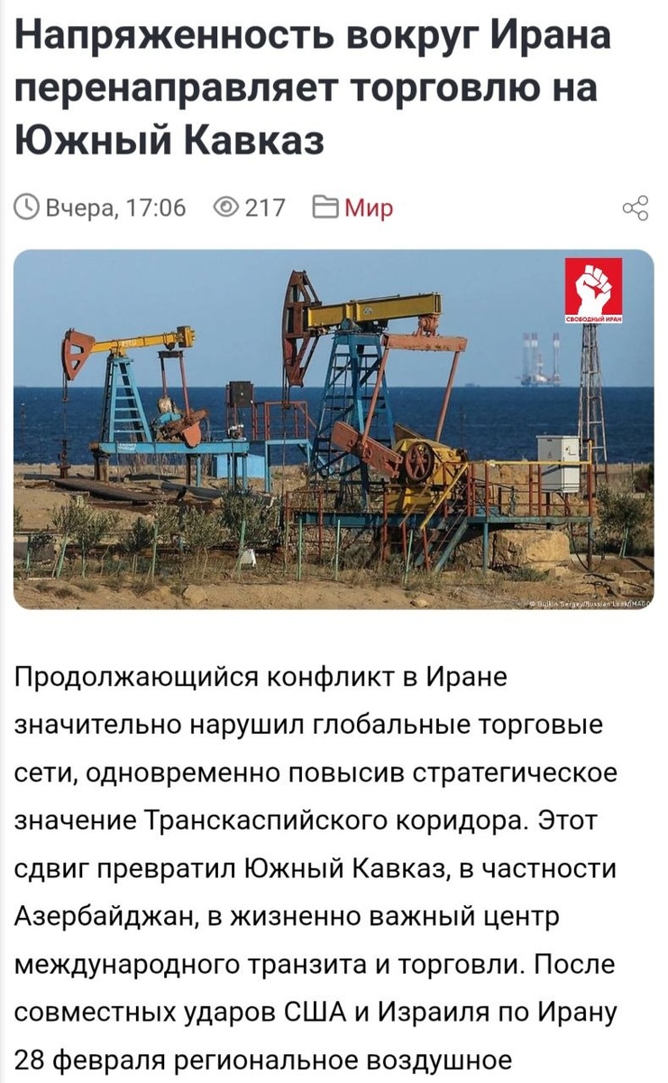 🛣⚡️ По данным zamin.uz, конфликт вокруг Ирана и ухудшение его отношений с Западом уже меняют карту мировой торговли: после ударов 🇺🇸 США и 🇮🇱 Израиля по Ирану в конце февраля грузопотоки ускоренно уходят через Южный Кавказ. На этом фоне Срединный коридор, а вместе с ним и роль 🇦🇿 Азербайджана, становятся все заметнее в международном транзите. Подпишитесь на канал