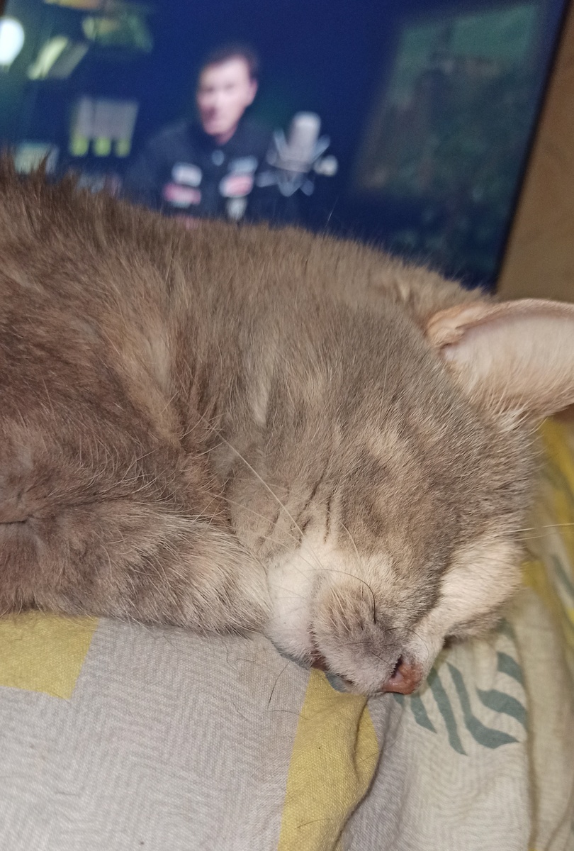 Когда ты весь день ела-ела...ела-ела...ела-ела...Из всех кошачьих мисок, и из собачьих, у матери из тарелки пыталась тырить, потом клянчила кекс, дико вопя во всё горло (кекс дали, конечно), потом просто на кухне сидела - в надежде. В итоге, очень, очень ПЕРЕУТОМИЛАСЬ!!! Да так, что вырубилась храпя и сопя, с открытым ртом и высунутым языком. В общем, всем доброй ночи от кошки Пиги! А