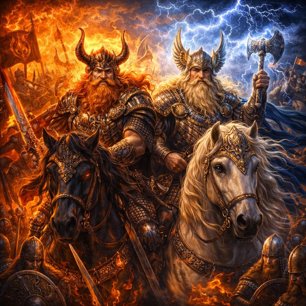 Он бог прямой силы. Не хитрого обхода. Не подземной игры. Не торговли. Его стихия — решение. Когда молния бьет, она не торгуется. Именно поэтому он так естественно сросся с дружиной. Дружина — это не толпа вооруженных мужчин. Это строй, верность, старшинство, поход, приказ, клятва и риск умереть под одним знаменем. Такому миру нужен не мягкий покровитель, а бог, который сам похож на удар.