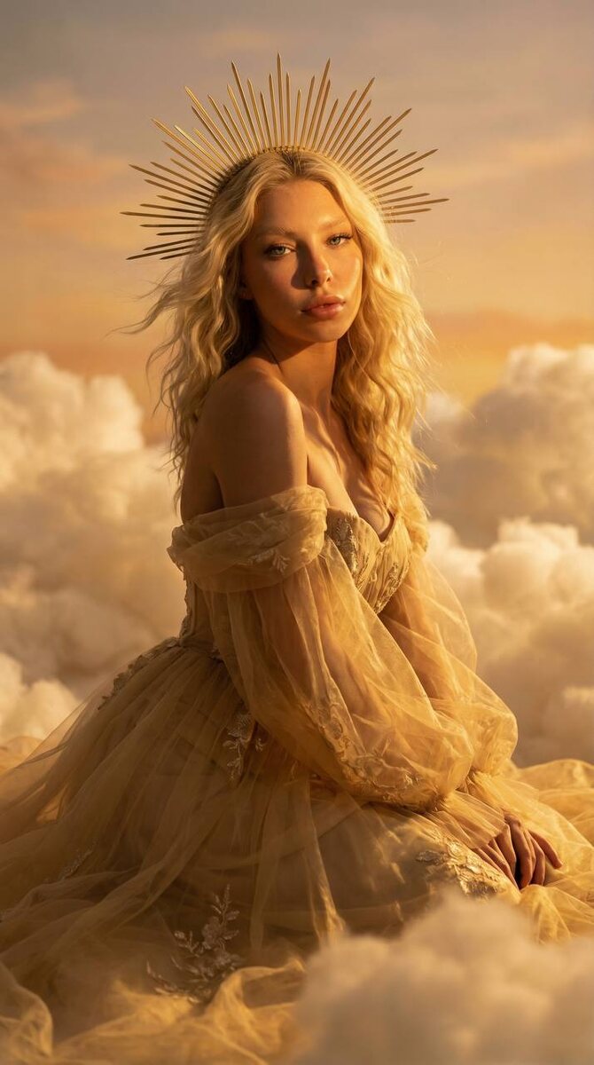 ✨✨✨✨✨✨ ИНСТРУКЦИЯ для генерации такого фото 📸: ✨зайди в бот https://t.me/aibudka_bot ✨ отправь свое фото в бот (лицо чётко видно) ✨ выбери Nano Banana Pro (обязательно ставь ползунок на pro для топ результата 🔛) ✨ параметры: 2K или 4К, 9:16 ✨ скопируй и вставь этот промпт: cinematic fantasy fashion portrait of a woman sitting elegantly among soft golden clouds, wearing an ethereal off-shoulder flowing gown made of translucent tulle layers with delicate embroidery, warm amber sky background with painterly atmospheric light, radiant golden halo crown made of thin metallic rays behind her head creating a celestial goddess aura, graceful seated pose with one leg slightly extended through the clouds, soft wind moving fabric and hair, dramatic editorial lighting with warm highlights and deep shadows, dreamy renaissance-inspired fantasy aesthetic mixed with modern fashion photography, soft volumetric mist surrounding the figure, luxurious textures and elegant composition, ultra detailed s
