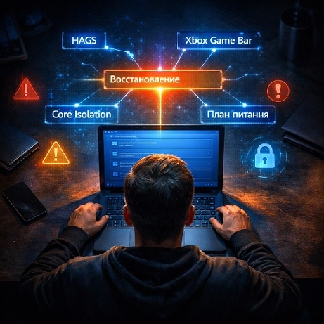 Вы сделали всё по инструкции. Но вместо прироста FPS — тормоза. Вместо тишины — шум кулеров. Не волнуйтесь, переустановка Windows не понадобится. Ниже — 7 сценариев, которые спасут ваши нервы и время. Выберите свой. Параметры → Конфиденциальность и безопасность → Общие → «Сброс настроек». Это сбрасывает только настройки приложения «Параметры», но часто подобного достаточно. Параметры → Система → Восстановление → «Вернуть исходное состояние ПК» → «Сохранить мои файлы». Если не готовы прощаться с программами — идите к пункту 6. Если не помогло: программа не вернула настройки. Идите к пункту 6. Параметры → Конфиденциальность и безопасность → Безопасность Windows → Безопасность устройств → «Сведения об изоляции ядра» → включить. Перезагрузка. Нюанс: при включении Windows может попросить удалить несовместимые драйверы. Соглашайтесь. Вернуть виртуализацию в BIOS: при загрузке нажмите Del или F2 → найдите Intel VT-x / AMD SVM → включите → сохраните. Как проверить: Что произойдет: система вер