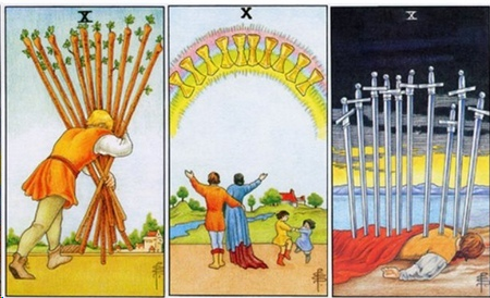 Теперь про десятку жезлов. Тут все иначе. Это максимальная концентрация воли и сил. Посмотрите на человека: он согнулся под тяжелой ношей. Спина болит, дороги не видно, но он прет.