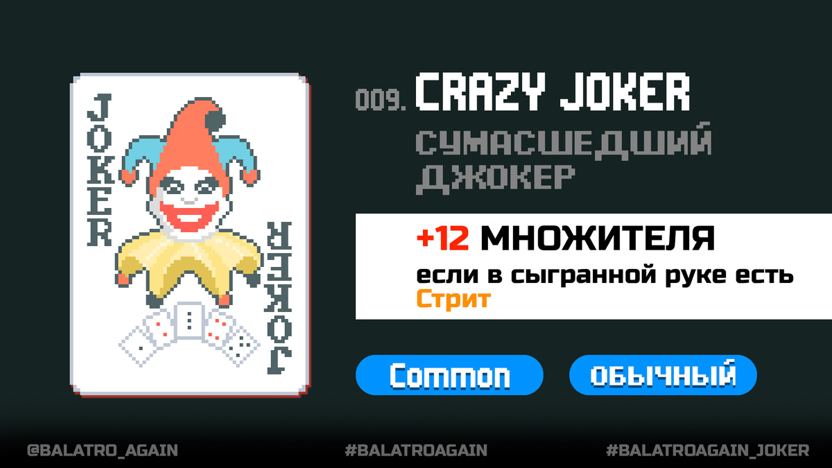 #jokers Следующий в очереди джокер со стабильным мультом это Сумасшедший джокер (Crazy Joker) — джокер, дающий +12 за любую руку, в которой есть комбинация Стрит. Этот же джокер работает и на Стрит-флеш. Из преимуществ: +12 множителя. Из минусов: сама идея того, что придётся играть в Стриты — не надёжная. Ну и то, что множитель не растёт — тоже не сахар. Хотя в начале игры нормально. ✔️ Лукавый джокер. +100 фишек это уже сильно приятно. ✔️ Орден. X3 множителя это ну вообще сверхзамечательно. ✔️ Бегун. Это растущие фишки (+15 фишек) за Стриты, в целом интересно, особенно на плазменной колоде. Но иногда не очень полезно. ✔️ Кратчайший путь. Вот с этим джокером уже можно идти в Стриты не боясь постоянно его не собирать. Джокер даёт возможность пропускать один ранг. ✔️ Четырёхпалый. Ещё один роскошный джокер для стритов, ведь он позволяет засчитывать комбинацию лишь из 4 карт. Да, периодически, строить билд на Стритах это чистой воды сумасшествие, но, не забываем, скоринг у Стритов тоже от