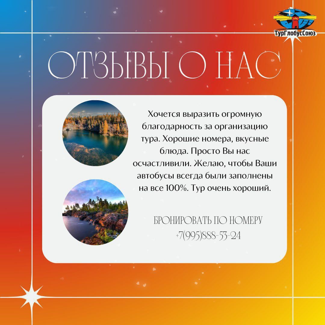 🔤🔤🔤🔤🔤🔤 Отзывы - это не просто слова, а живые истории, которые рассказывают о лучших моментах наши туристов. Они - Наш самый ценный актив, отражающий впечатления клиентов. 🙂 Делитесь и вы своими впечатлениями из поездок! Ведь это помогает сделать выбор другим