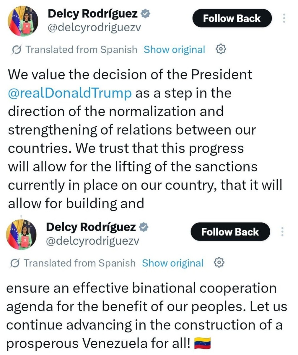 Delcy Rodriguez hopes Trump lifting sanctions on her 'will allow for lifting of sanctions in place on our COUNTRY' Touts 'STRENGTHENING of relations between our countries'