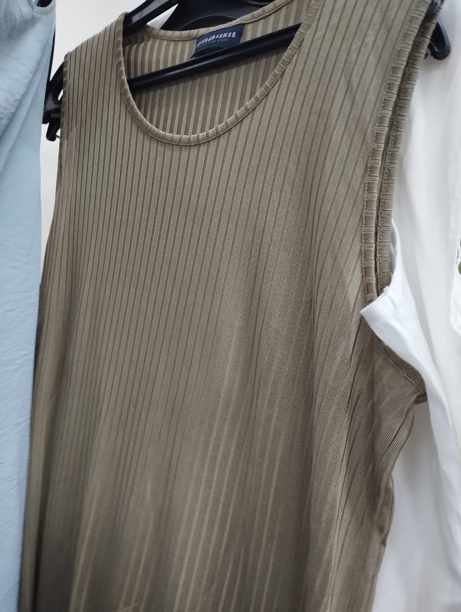 Относительно удачным посещением секонд-хенда я считала те моменты, когда удавалось найти хотя бы более-менее базовые вещи. Майка на фото, например, отлично бы подошла под южную погоду или в качестве одежды с жакетом, например, но купили бы вы ее за 600 рублей? Ткань самая обычная, бренд не особо популярный, если не ошибаюсь, а выглядит майка абсолютно обычно, благо хоть чистая и без катышек.