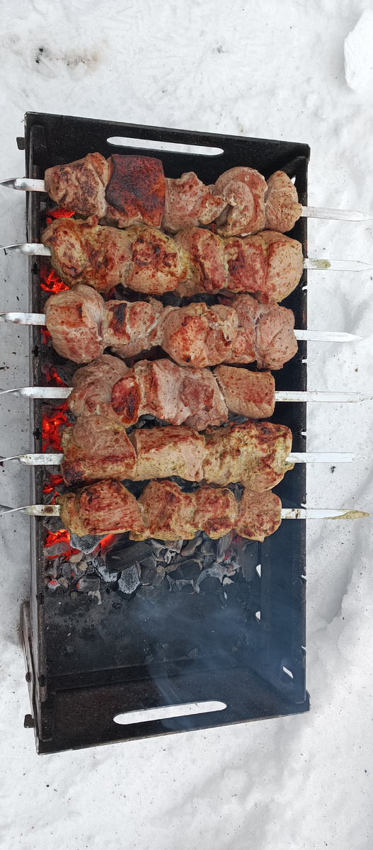 Шашлык.., он всегда шашлык... А на снегу, так вроде как и вкуснее или просто вкус зимний, а в мае майский)))