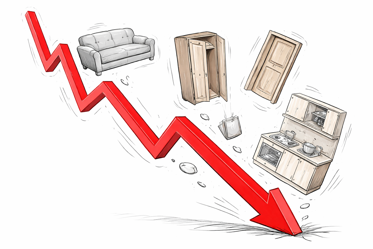 Реальные продажи падают быстрее, чем сокращаются производства. Индекс промышленного производства мебели по данным Росстата за 2025 год сократился на 6,9%. Но продажи, по данным отраслевых источников, просели почти на 20%. Разрыв между производством и продажами — это затоваривание, которое будет давить на цены и маржу ещё минимум год. Меньше рискуют те производства, которые работают по индивидуальным заказам.