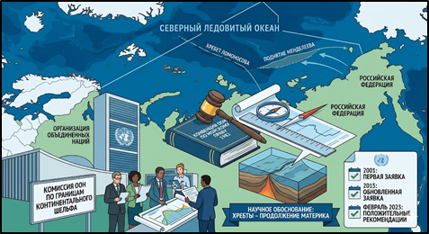 Современный правовой статус Арктики характеризуется наличием неурегулированных территориальных претензий прибрежных государств на одни и те же участки морского дна. Конфликт интересов обусловлен географическим наложением зон предполагаемого расширения континентального шельфа России, Дании и Канады в районе центральных арктических поднятий. Основным предметом спора является разграничение прав на недра и ресурсы морского дна за пределами исключительной экономической зоны. Поскольку международное право связывает расширение границ шельфа с геологическим строением океанического дна, решение данного вопроса требует не только дипломатического согласования, но и научного подтверждения непрерывности континентальной окраины каждого из претендующих государств. Российская Федерация осуществляет деятельность по уточнению границ своего континентального шельфа в Северном Ледовитом океане в строгом соответствии с международным правом. Основным документом, регулирующим этот процесс, является Конвенция