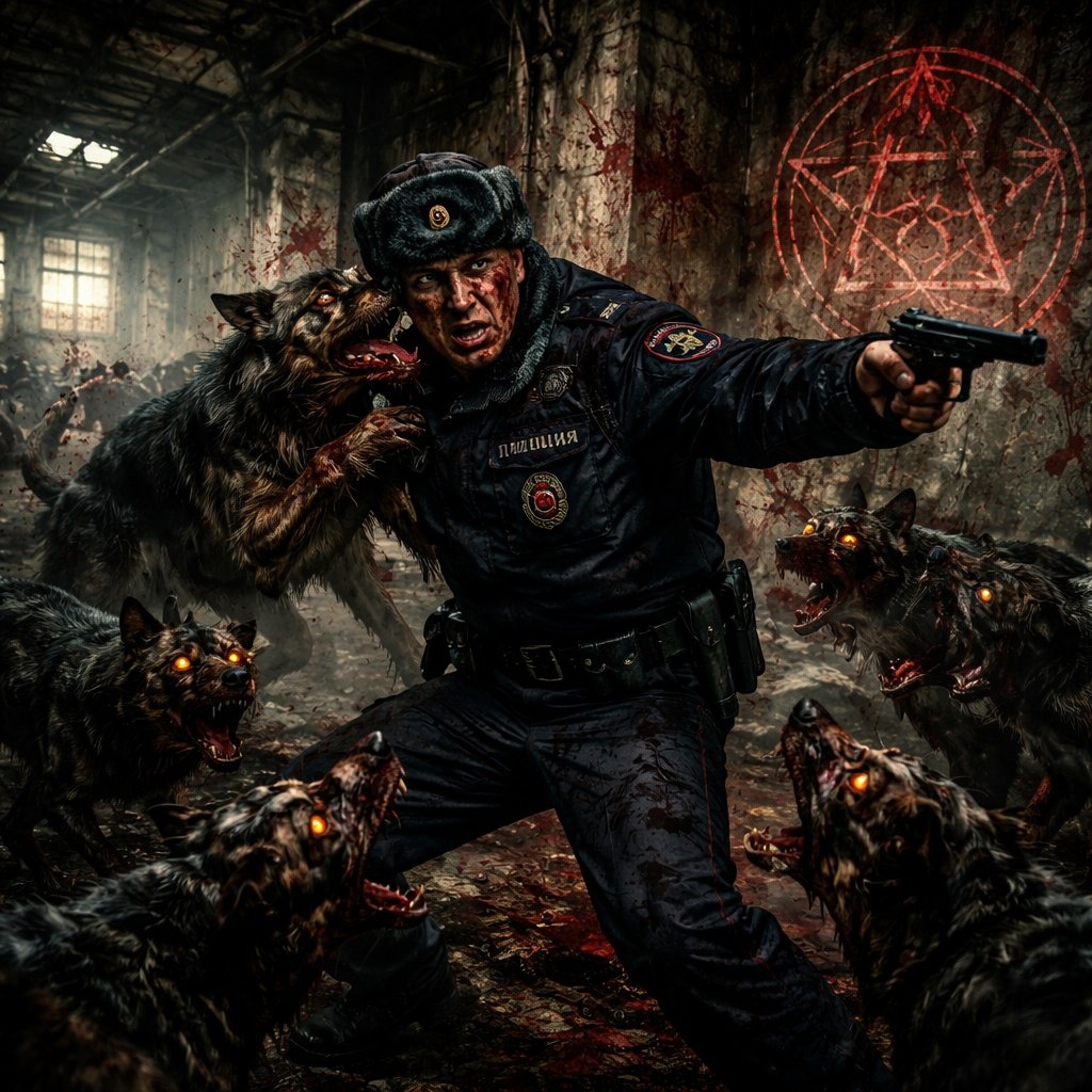 Прежде чем дуло табельного оружия успело подняться, из темноты вынырнули оскаленные окровавленные морды. Мертвая стая с глухим, клокочущим рычанием бросилась вперед. Тяжелые туши ударили полицейского в грудь, сбивая его с ног. Смирнов рухнул на спину с оглушительным стуком, и в то же мгновение по подвалу разнесся его истошный крик. Мертвые челюсти сомкнулись на его теле, с первобытной яростью разрывая плотную ткань полицейской формы, прокусывая кевлар и вгрызаясь в живое, пульсирующее мясо. Кровь брызнула на покрытый инеем бетон, пока чудовища рвали свою добычу на части.