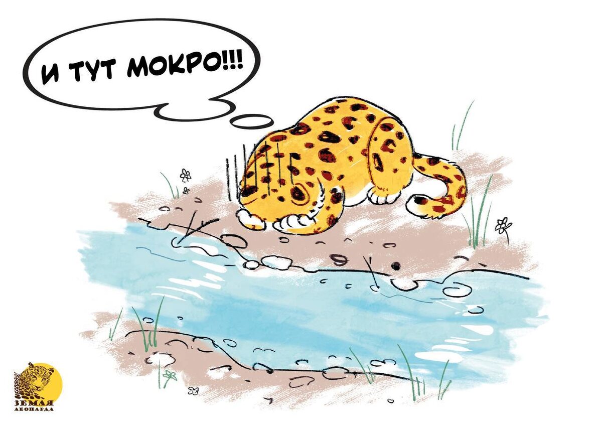 !!! 😩 Продолжаем узнавать больше о дальневосточном леопарде благодаря красочным иллюстрациям. Дальневосточные леопарды действительно не очень любят воду и всё, что с ней связано, прямо как многие из нас не любят ранний подъём или звук скрежета вилки о тарелку. Во время дождя или снега леопарды предпочитают оставаться в укрытии. А если на пути пятнистого встречается водоём, то, вероятнее всего, маршрут будет перестроен: при любой возможности обойти/перейти препятствие, он обязательно ею воспользуется. Не забываем, что леопарды — котики, хоть и большие. Но, конечно, не все котики боятся воды: амурский тигр, например, намокнуть не боится и запросто может переплыть даже реку Амур. 🐆 Здесь «Земля леопарда» / МАХ