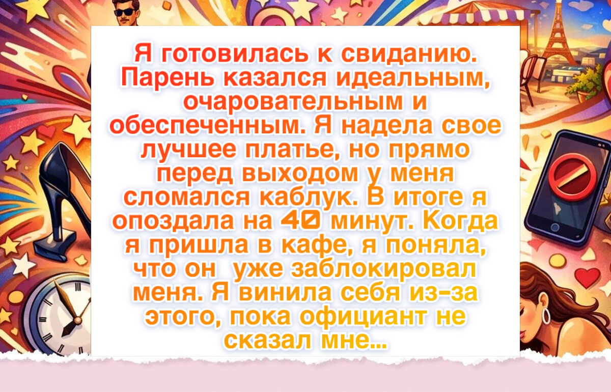 “Я собиралась на свидание, сломался каблук, порвались колготки, я опоздала на 40 минут. Когда пришла, оказалось, что мужчина меня заблокировал и ушел. Официант сказал, что пока ждал, он скандалил из-за каждой копейки в счете и грубил персоналу. Похоже, сломанный каблук спас меня от очень неприятной жизни.”