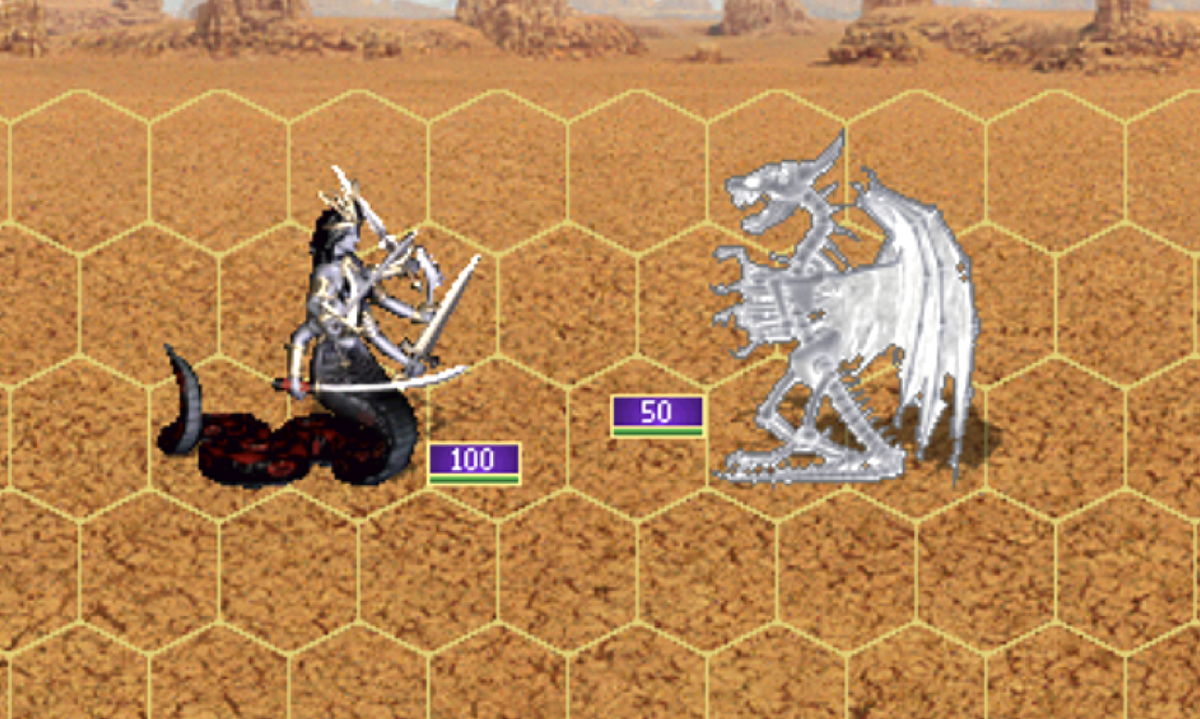 В прошлый раз я решил проверить, насколько слабы призрачные драконы, и свёл их с рыцарями ужаса. Но потом понял, что такая дуэль не раскрывает всех возможностей призрачных драконов, и устроил новую дуэль, но на этот раз с живыми существами. Кто по силе не уступает рыцарям ужаса? Королевы-наги, конечно же! В этот раз 50 призрачных драконов вышли на бой против 100 королев-наг. Десять отрядов, десять стычек. К сожалению для самых высших существ Некрополиса, и здесь плохие новости: они все десять дуэлей проиграли. Даже если старение срабатывало после первого удара, королевы-наги уверенно побеждали — минимально в отряде осталось 44 королевишны. Разумеется, первый удар наносили призрачные драконы, но это им не помогло. Единственное: за всё время ни разу не сработала отрицательная мораль, потому что в армии героя были только наги (мораль +1 за войска одной фракции), но не думаю, что это бы как-то исправило ситуацию. Всё-таки безответная атака наг решает. Потом решил уменьшить отряды и свести