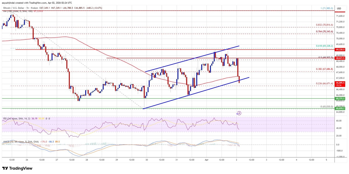 Биткойн не смог удержаться выше $68,800 после кратковременного восстановления и сейчас торгуется ниже $67,200. Это указывает на усиление позиций продавцов и возможное дальнейшее снижение цены. Ключевые уровни сопротивления не были пробиты, что привело к потере предыдущих достижений. 📊 Ключевые моменты: - BTC не закрепился выше $68,800 и 100-часовой SMA. - Пробит восходящий канал с поддержкой на $67,200. - Медведи активны около зоны сопротивления $69,200. - Уровни поддержки: $66,000, $65,750, $65,500. - Уровни сопротивления: $67,800, $68,500, $69,250. - MACD набирает обороты в медвежьей зоне, RSI ниже 50. ⚠️ Риски: Если BTC не удержится выше $66,000, возможно дальнейшее падение к $65,000 и $64,200. Горизонт: краткосрочно