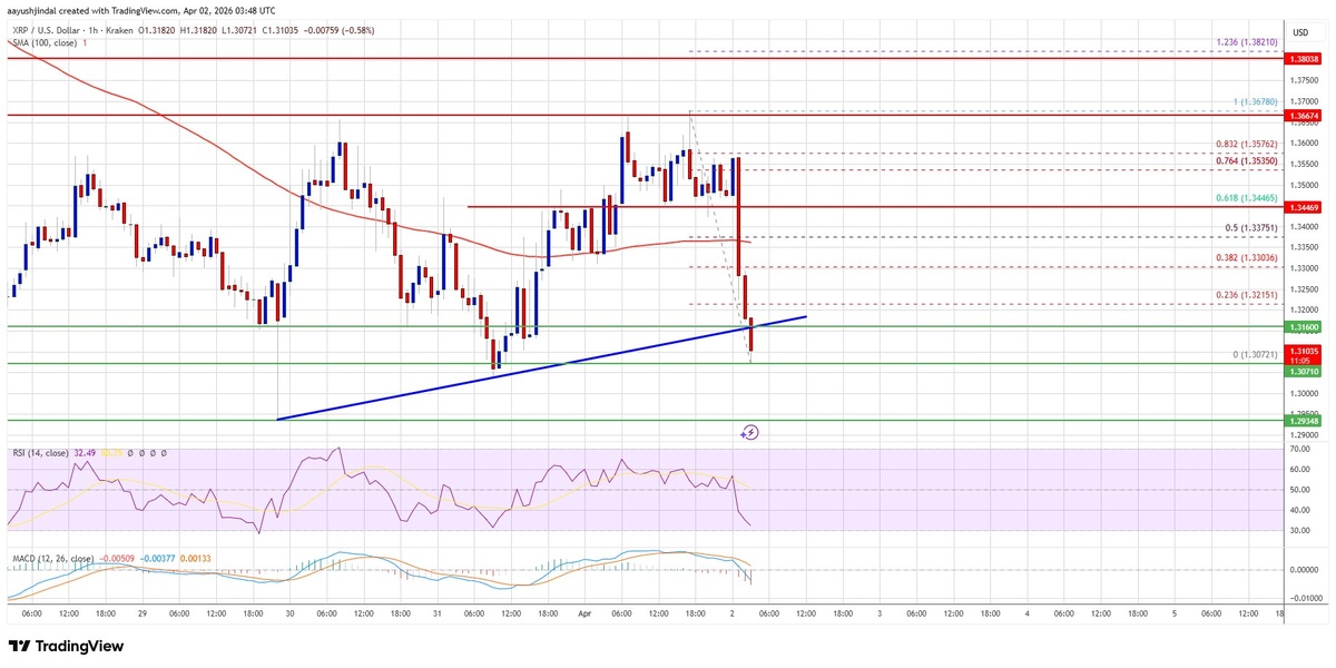 XRP продолжил снижение, опустившись ниже психологически важной отметки в $1.3250. Актив торгуется значительно ниже 100-часовой простой скользящей средней, что указывает на усиление медвежьего давления. Прорыв бычьей линии тренда на уровне $1.3160 подтверждает смену краткосрочного тренда на нисходящий. 📊 Ключевые моменты: - Цена XRP составляет $1.3072 на момент формирования локального минимума. - Пробита важная зона поддержки $1.3220 и $1.3150. - Ключевые сопротивления на отметках $1.3250, $1.3450 и $1.3650. - Основные уровни поддержки находятся в районе $1.3080 и $1.30. - MACD набирает силу в медвежьей зоне, RSI ниже 50. ⚠️ Риски: Если XRP не сможет преодолеть сопротивление $1.3450, возможно дальнейшее снижение к $1.2880 и $1.2750. Горизонт: краткосрочно