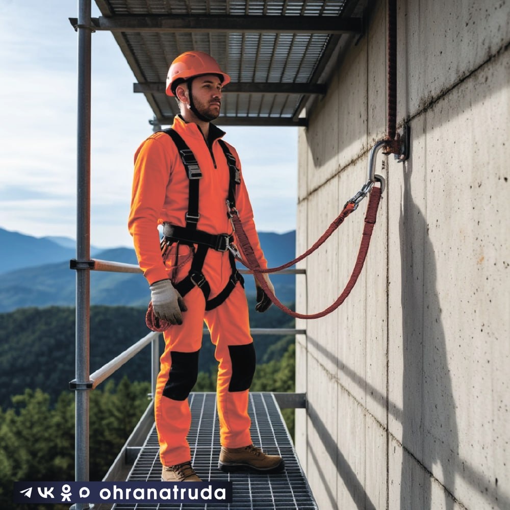 ☝️ Согласно приказу Минтруда РФ от 16.11.2020 № 782н, страховочная привязь обязательна при: 📌 работах на высоте от 1,8 м; 📌 работах ближе 2 м от неограждённых перепадов высотой от 1,8 м; 📌 работах над машинами, жидкостями или выступающими предметами - даже на малой высоте. Как использовать: 1⃣ Осмотрите привязь: проверьте на повреждения, надёжность креплений. 2⃣ Наденьте привязь: пояс - на талии, ножные и плечевые лямки - на своих местах. 3⃣ Отрегулируйте: затяните плечевые лямки, соедините их с поясом через пряжки и карабины. 4⃣ Изучите инструкцию производителя для конкретной модели. Как и к чему крепить: Привязь крепится к анкерному устройству (временному или постоянному) с помощью: 🔻 стропа (одинарного или двухплечного) или блокирующего устройства втягивающего типа. Анкер должен находиться вертикально над рабочей зоной, выдерживать заявленную нагрузку и обеспечивать достаточный запас высоты. После падения привязь и все компоненты системы изымаются из эксплуатации. ⭐