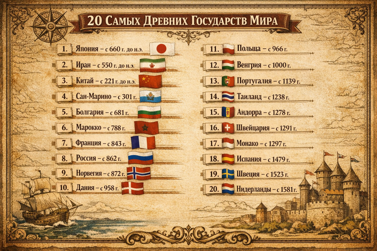 1. Япония — традиционно самая древняя в таком рейтинге; отсчёт обычно ведут от 660 года до н. э., при этом ранняя дата носит скорее легендарно-традиционный характер. 2. Иран — линия государственности обычно ведётся от державы Ахеменидов, от 550 года до н. э.; дальше шли Персия и современный Иран. 3. Китай — в таких списках обычно считают от объединения Цинь в 221 году до н. э.; позже менялись династии и режимы, но сохранялась идея единого китайского государства. 4. Сан-Марино — один из самых бесспорных примеров очень древней непрерывной государственности; традиционная дата основания — 301 год. 5. Болгария — начало обычно считают от 681 года, от Первого Болгарского царства; затем были царства и современная республика. 6. Марокко — обычно ведут отсчёт от государства Идрисидов конца VIII века; дальше шла преемственность марокканских династий. 7. Франция — чаще всего считают от 843 года, от Западной Франкии, хотя есть и более ранние трактовки. 8. Россия — здесь отсчёт идёт от 862 года, о