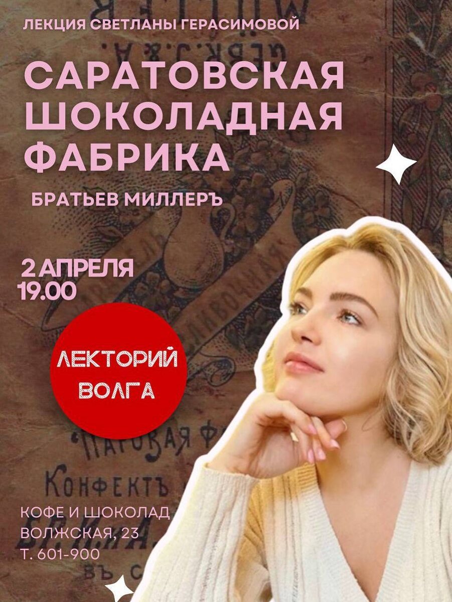 «ШОКОЛАДНАЯ ФАБРИКА БРАТЬЕВ МИЛЛЕРЪ». Приглашаем в незабываемое сладкое путешествие! Спикер: Экскурсовод-лектор Герасимова Светлана. ✴️Ждём вас! Вкусы прошлого — 2 апреля в 19:00! 📍Кофе и шоколад на Волжской, 23 Билеты можно купить по ссылке Всё расписание лектория Лекторий "Волга" МАХ ВКонтакте http://lektoriyvolga.ru/