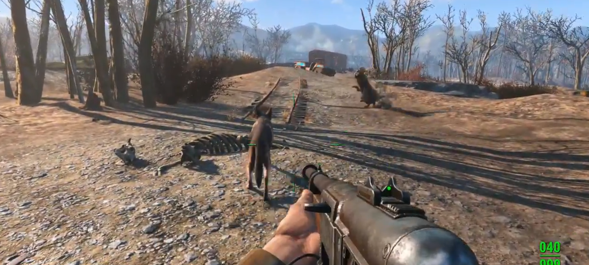 После дома Келлога всё стало… чётче. Он ушёл и ушёл давно. Обычным способом его уже не найти. И вот тут помогает она. Собака. Ник предлагает простое решение: дать ей взять след. И вот здесь Fallout снова меняет темп. Ты больше не бежишь, не штурмуешь, ты идёшь по следу. Псина берёт запах. Мы выходим из города, идем вдоль железнодорожный путей, впереди вижу скелет брамина, подозрительно... Ловушка! Выводок кротокрысов, вместе с маткой нападают неожиданно. И как же повезло мне, потому что в руках у меня дробовик, и как же не повезло им, не имея никакой брони на теле. Не смотря на засаду, они не доставили никаких проблем. Собака смогла отвлечь половину, пока я разобрался с самыми сильными. Идём дальше. Из далека вижу упавшее дерево, перегородившее дорогу, решаю немного замедлиться осмотреться, и не зря. Карликовый яогай, ждет когда кто-нибудь заглянет к нему на огонек. Я заметил его первым, и это решило исход битвы. Собака не останавливается, продолжая идти по следу. Сворачиваем к мосту