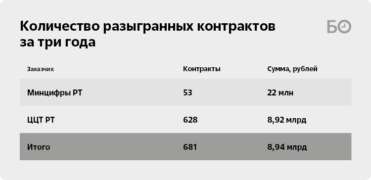 В целом, московские компании за три года получили от ЦЦТ порядка 930 млн рублей — более 10% от общего объема контрактов. Всего за пределы Татарстана ушло контрактов примерно на 1,7 млрд рублей из 9 млрд, или около 19% бюджета.
