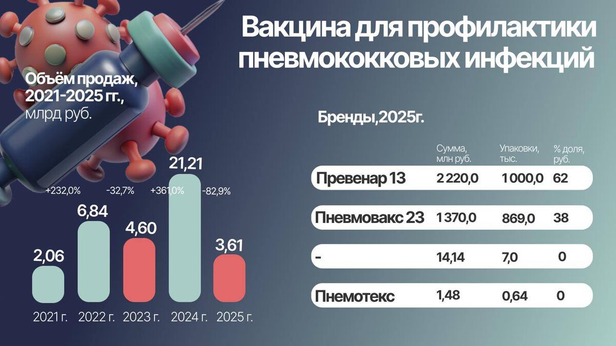 «Пневмикс 16». В настоящее время проходит третья фаза клинических испытаний с участием детей в возрасте от 2 до 17 лет. Пневмококковая инфекция по-прежнему занимает одно из ведущих мест среди бактериальных заболеваний у детей. Она может приводить к развитию пневмонии, отитов, синуситов, а в тяжелых случаях к менингиту и сепсису. Наибольшему риску подвержены дети младшего и школьного возраста из-за недостаточно сформированной иммунной системы. А что с госзакупками данной вакцины?📊 Скачок в 2024 году связан с закупкой 80% всего объема в рамках ФЦП «Вакцинопрофилактика» на сумму 17,13 млрд руб. с длительными двухлетними поставками на 2025–2026 гг. Основной поставщик «Превенар 13» - НПО Петровакс, на сумму 15,80 млрд руб. 📉 При этом в 2025 году: 95% закупок были объявлены в рамках льготных программ за счёт региональных бюджетов, общий объём которых составил 3,45 млрд руб. Основные топ-3 поставщика: 🔴Фармлайн - 1,23 млрд руб. 🔴Биоритм - 786 млн руб. 🔴Аллерген - 262,15 млн руб. 💉 В