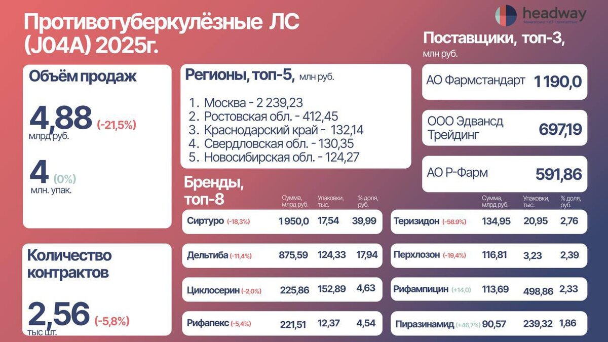 Туберкулёз остаётся одной из самых опасных инфекций в мире: ежегодно заболевают около 10 млн человек, а более 1 млн - умирают. Несмотря на развитие медицины, заболевание всё ещё требует системной лекарственной терапии и стабильного обеспечения препаратами. В России сохраняется устойчивая тенденция на снижение заболеваемости туберкулёзом. Для снижения заболеваемости в России реализуются профилактические мероприятия: вакцинация БЦЖ вакциной отечественного производства, скрининговые осмотры с помощью кожных проб. У детей старше 15 лет и у взрослых для диагностики применяется флюорография. На этом фоне интересно посмотреть бюджетный рынок госзакупок противотуберкулёзных препаратов в России. 📊 Противотуберкулёзные ЛС (J04A), 2025 Рынок демонстрирует снижение: 💰 4,88 млрд руб. (-21,5%) 📦 4 млн упаковок (без изменений) 📉 2,56 тыс. контрактов (-5,8%) Объем продаж в деньгах падает, а объём в упаковках остаётся на прежнем уровне. 📍География Москва остаётся абсолютным центром закупок -бо