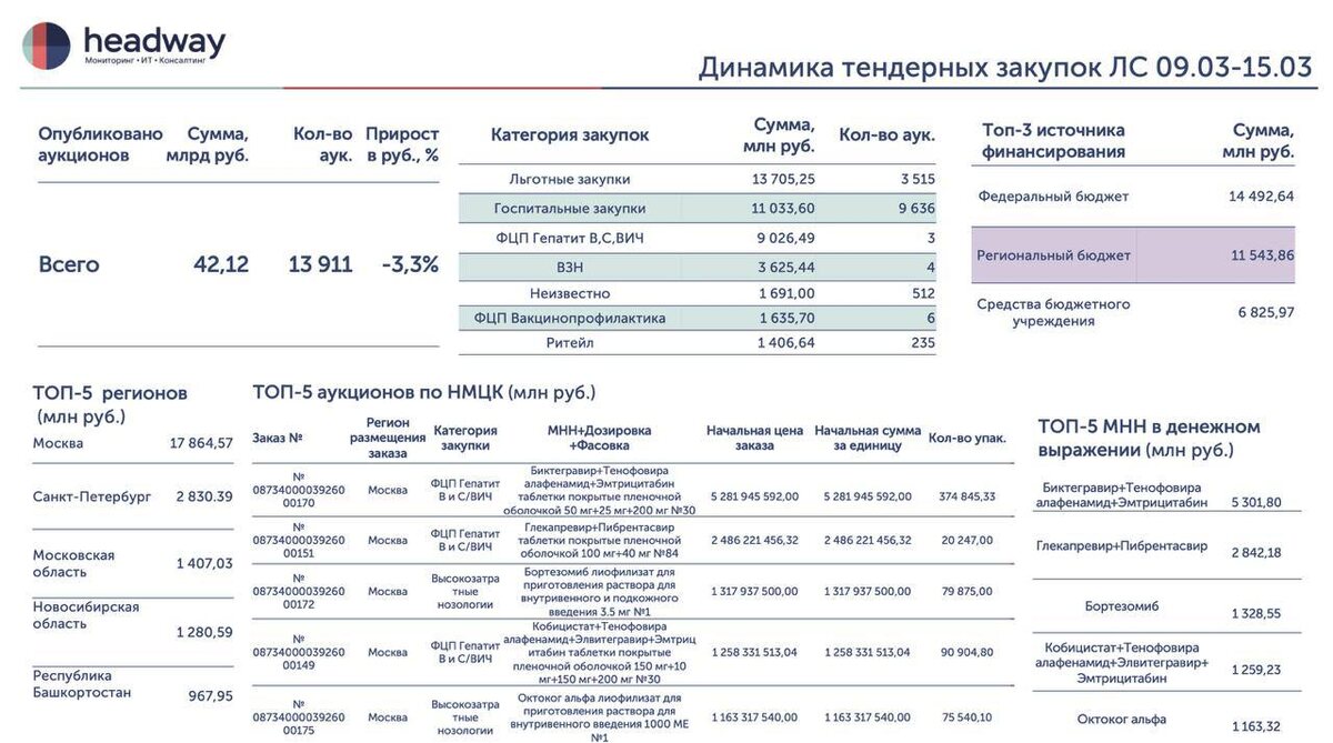 📊 Делимся краткой инфографикой тендерных закупок за период 09.03–15.03 (в сравнении с 02.03–08.03) 📆 📈 Общая динамика Объём опубликованных аукционов немного снизился: 43,57 млрд руб. → 42,12 млрд руб. (−3,3%, −1,45 млрд руб.). Количество аукционов также сократилось: 15 919 → 13 911 (−2 008). 👉 После роста предыдущей недели рынок перешёл в стадию стабилизации. 💊 Категории закупок 😷 Льготные закупки - крупнейший сегмент: 13,7 млрд руб. 🏥 Госпитальные закупки - 11,0 млрд руб. 🧬 ФЦП (гепатит В, С/ВИЧ) - 9,0 млрд руб. 💊 ВЗН - 3,6 млрд руб. 👉 Усилилась доля федеральных программ, особенно по ВИЧ и гепатитам. 💰 Источники финансирования 🇷🇺 Федеральный бюджет - 14,49 млрд руб. 🏛 Региональный бюджет- 11,54 млрд руб. 🏥 Средства бюджетных учреждений - 6,83 млрд руб. 👉 Структура финансирования остаётся сбалансированной, с ведущей ролью федерального центра. 📍 Регионы Лидер - Москва (17,86 млрд руб.) 🚀 Далее: • Санкт-Петербург - 2,83 млрд руб. • Московская область - 1,41 мл
