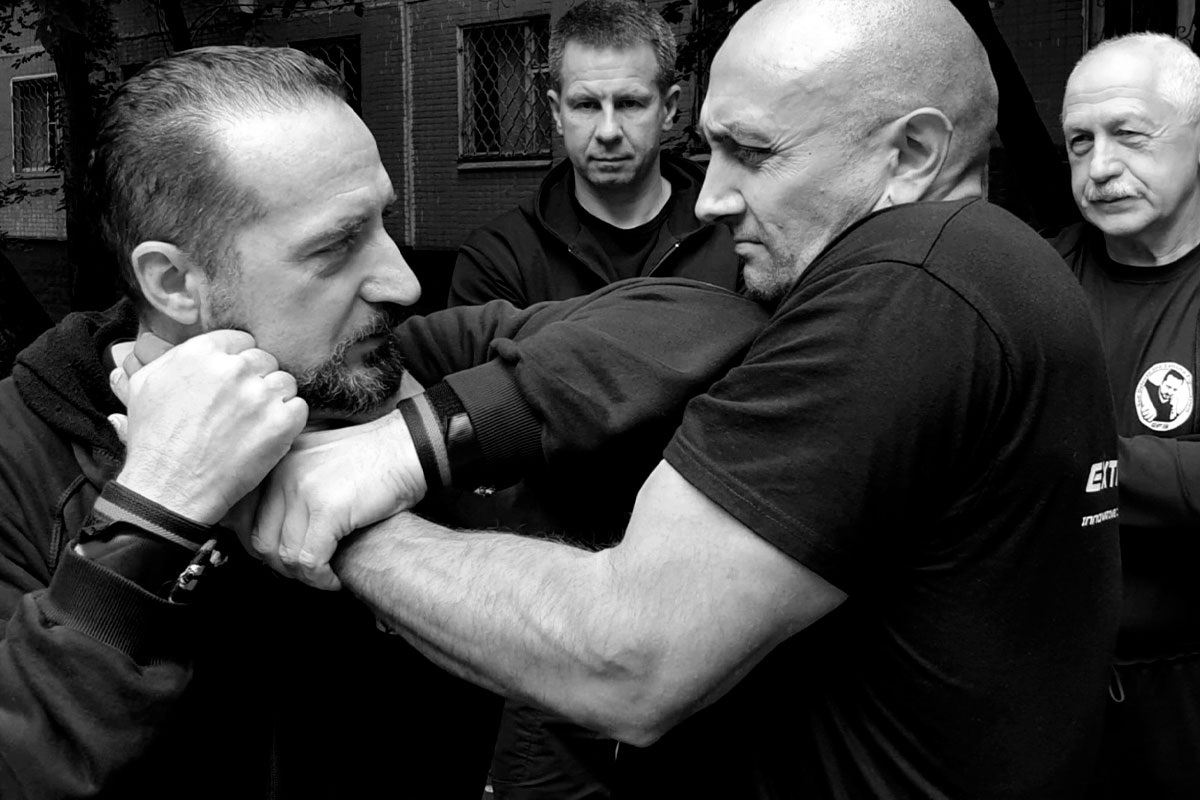 Захват за отвороты одежды — типовое агрессивное действие, ответные приёмы на которое предлагаются во всех без исключения системах самообороны и единоборствах, стремящихся сформулировать «свои» разделы для самозащиты своих последователей. В ЭРБ на данное агрессивное действие предлагаются разные варианты срыва такого захвата и выход на безопасную дистанцию. И этого достаточно! В «Экстрим Файт» есть понимание, что захват за отвороты одежды не то агрессивное действие, на которое сразу нужно идти в активную атаку с поражением уязвимых мест, выкручивать суставы, приводить агрессора в состояние беспомощности и добивать. Тем не менее, большая часть существующих приёмов самообороны на такое типовое действие предлагают именно то, о чем написано выше — в этом можно убедиться, посмотрев разделы самообороны подавляющего числа видов единоборств и боевых искусств. В итоге, происходит превышение пределов необходимой обороны с точки зрения закона любой страны, поскольку захват за отвороты одежды, даже сопровождаемый грубыми угрозами, по факту не является очевидной опасностью, на которую адекватно проводить жёсткие атаки, повреждения суставов, броски и сбивания с ног с добиванием или взятие на болевой контроль. Всё это нарушение «принципа соразмерности» в юридическом аспекте, которое приводит на скамью подсудимых самого горе-защищающегося.