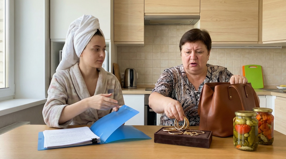 Рука свекрови застыла над открытой сумкой.