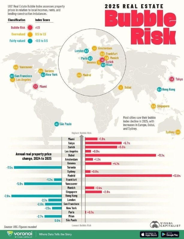 ! В 2025 году UBS забил тревогу: рынок недвижимости Дубая перегрет сильнее всех крупных городов с ростом цен на 50% за пять лет. Кто-то видит там устойчивый рост с туризмом и инвестициями, а я говорю — это напоминает казино с рулеткой на максимуме. Риск пузыря вырос в два раза, и если он лопнет, обвалит не только местных, но и зарубежных инвесторов. В 2026-м нас ждут американские горки — либо жирные иксы, либо крупный лось, а делать ставку вслепую — значит идти в прямой минус. Мой совет — держите кэш на случай ректов и не стройте планы на хаях. #новости #БезПафосаФинансы #недвижимость #инвестиции #UBS #МыслиАлекса