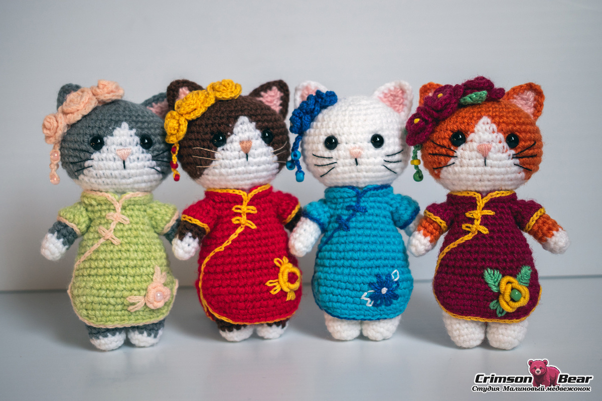 Яркие кошечки в традиционных китайских платьях. Размер 11 см. В хвостиках проволочный каркас, могут стоять самостоятельно, опираясь на него. Можно использовать как брелок, подвес на сумку или игрушку. Для самостоятельного вязания оформлен подробный платный мастер-класс. Подробный мастер-класс со множеством фото и подробным описанием каждого этапа можно приобрести по ссылке: ВК или eiwi.ru